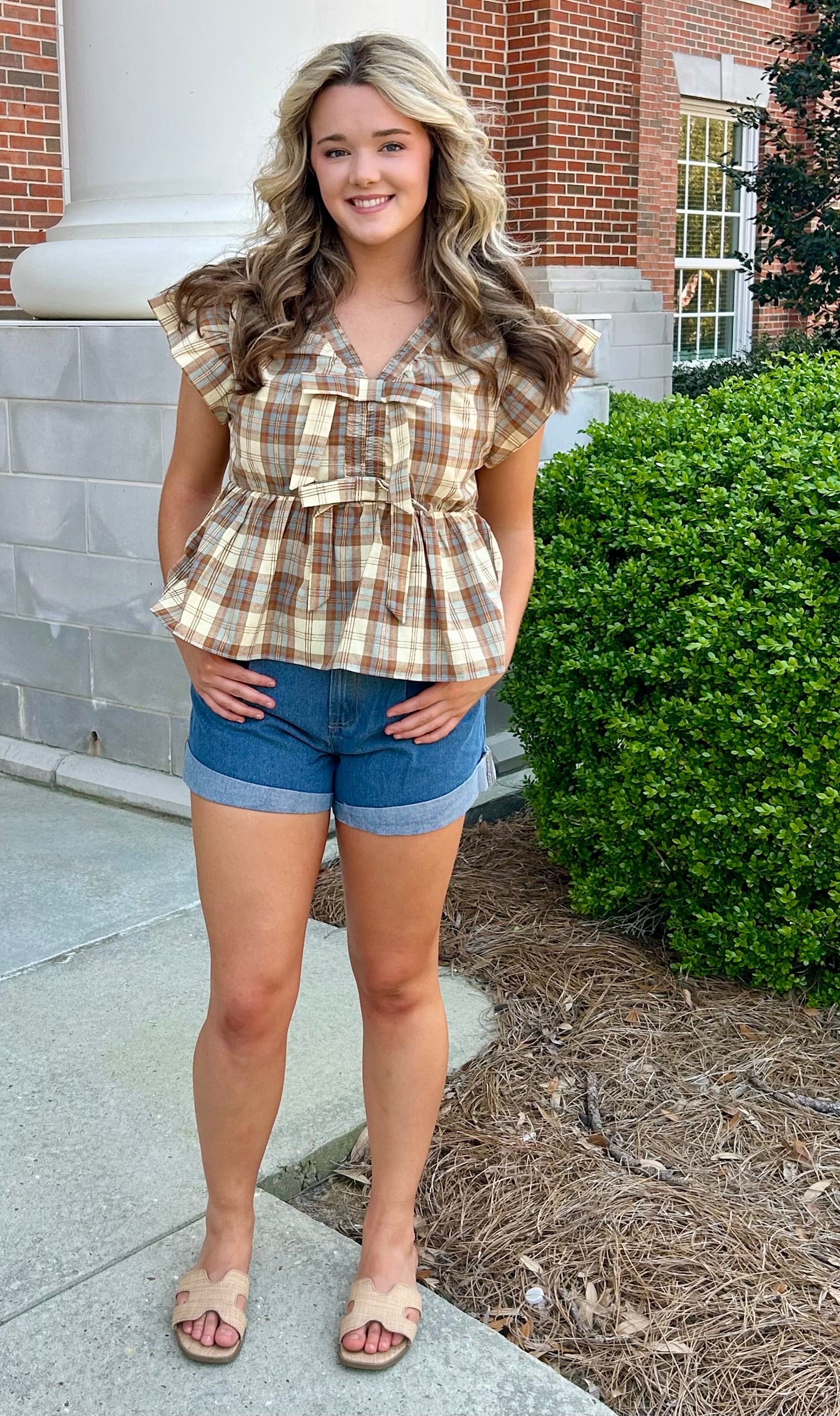 Medium denim washed shorts with a button closure, back elastic waist band and cuffed legs.