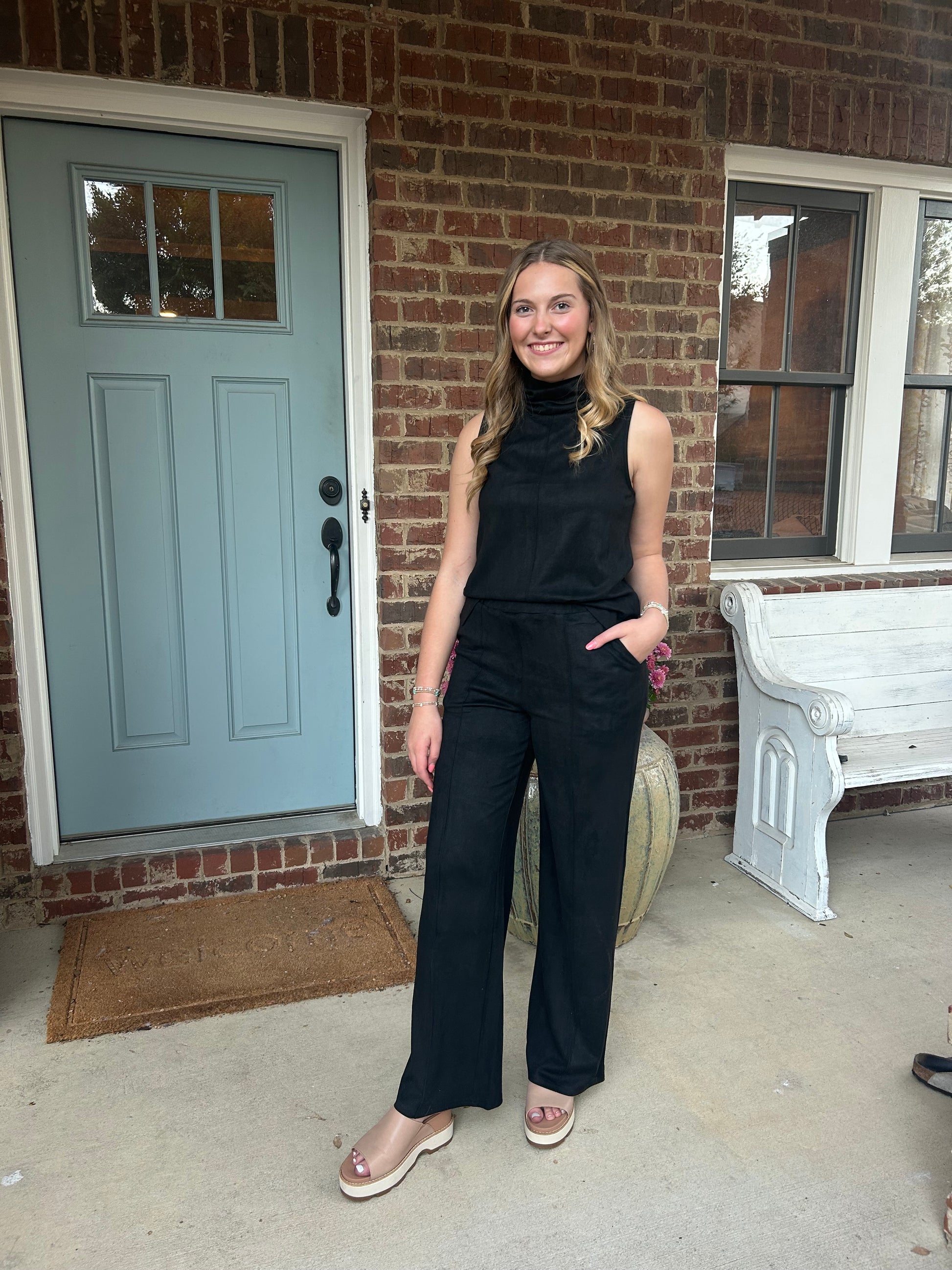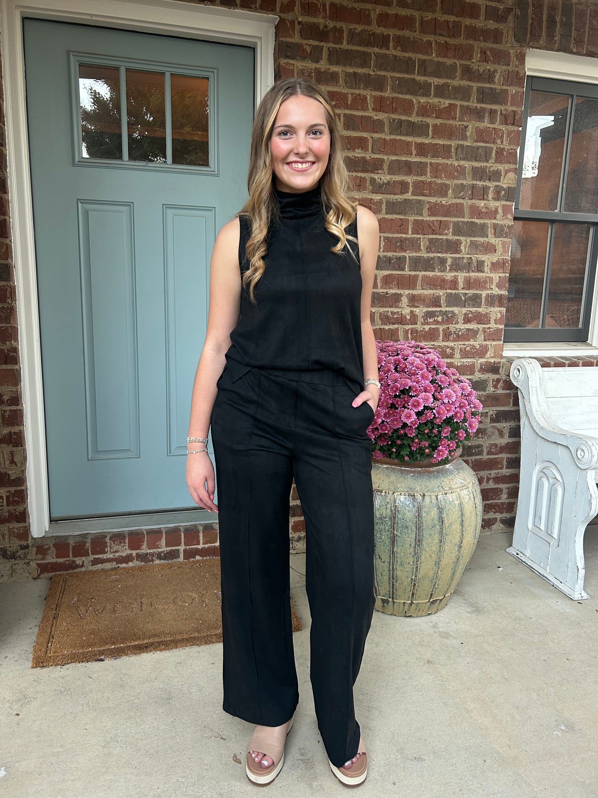 A comfortable suede stretch pants set. The top is a sleeve turtle neck with front stitching and side slits. The pants are elastic waist and wide leg.