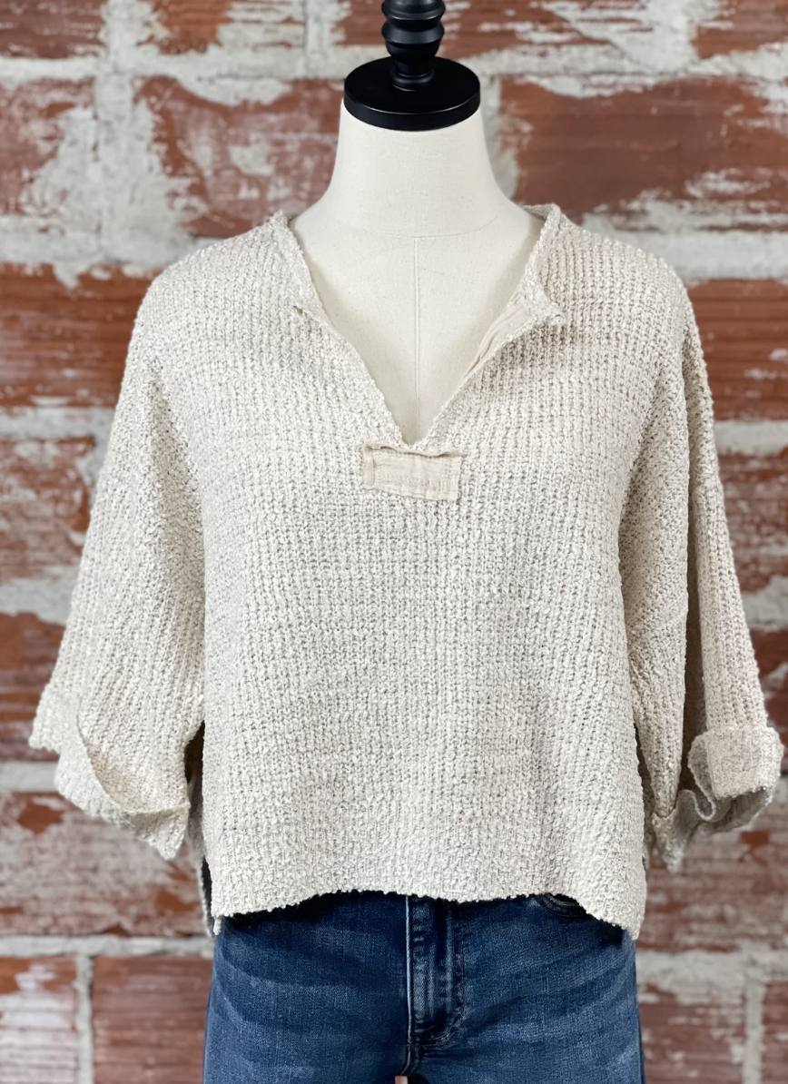 Our Summer Breeze Knit Sweater in cream is a textured 3/4 sleeve sweater with rolled cuff is perfect for pairing with your favorite jeans. Featuring a notched neckline with a front patch detail, two side slits, and a waist-length cut, it's both fashionable and functional.